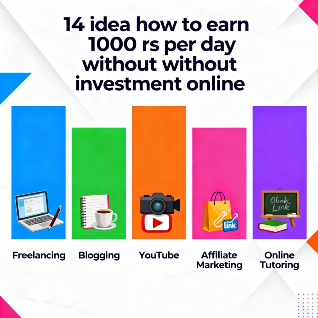 14 idea how to earn 1000 rs per day without investment online बिना किसी निवेश के इंटरनेट के माध्यम से हर दिन 1000 रुपये कमाना अब केवल सपना नहीं, बल्कि सही जानकारी, मेहनत और स्मार्ट प्लानिंग से पूरी तरह संभव है। इसमें फ्रीलांसिंग, कंटेंट राइटिंग, ऑनलाइन ट्यूटरिंग, एफिलिएट मार्केटिंग, ब्लॉगिंग, यूट्यूब, ऐप्स, सोशल मीडिया और कई अन्य वैध तरीके हैं जिनके जरिये लोग आज सचमुच घर बैठे अच्छी कमाई कर रहे हैं।