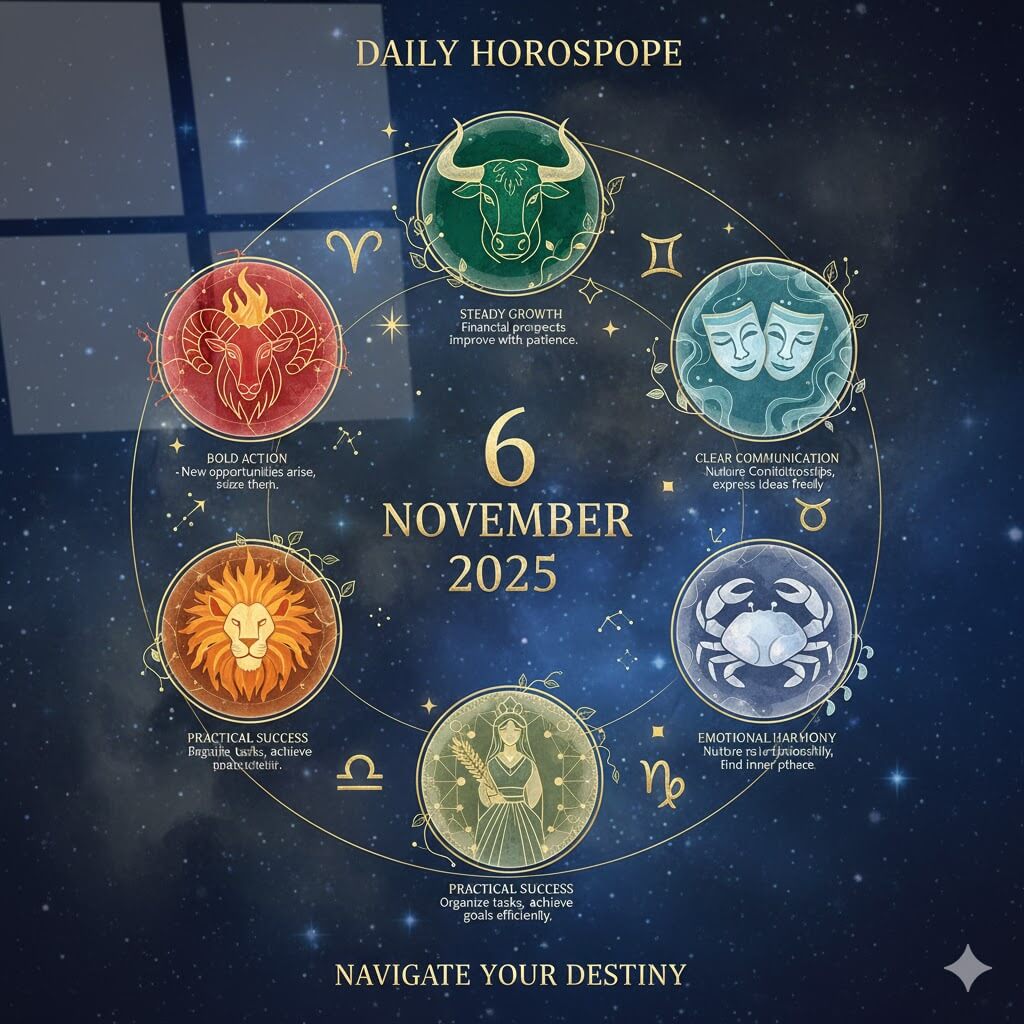 Aaj ka Rashifal 6 november 2025, गुरुवार को सूर्य तुला राशि में और विशाखा नक्षत्र में गोचर करेंगे, जिसका व्यापक असर कई राशियों के जीवन पर पड़ेगा। आज कृत्तिका नक्षत्र, प्रतिपदा तिथि, व्यतिपात योग और तैतिल करण रहेगा। सूर्योदय प्रातः 06:40 और सूर्यास्त शाम 17:28 पर होगा। चंद्रमा आज मेष राशि में, पंचांग में कार्तिक कृष्ण पक्ष रहेगा। Daily Horoscope November 6 2025