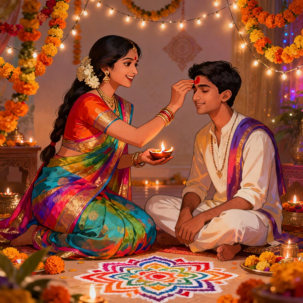 - उत्तर भारत: भाई दूज के दिन बहनें तिलक करके अपने भाइयों की लंबी आयु की कामना करती हैं और भाई उन्हें गिफ्ट देते हैं।